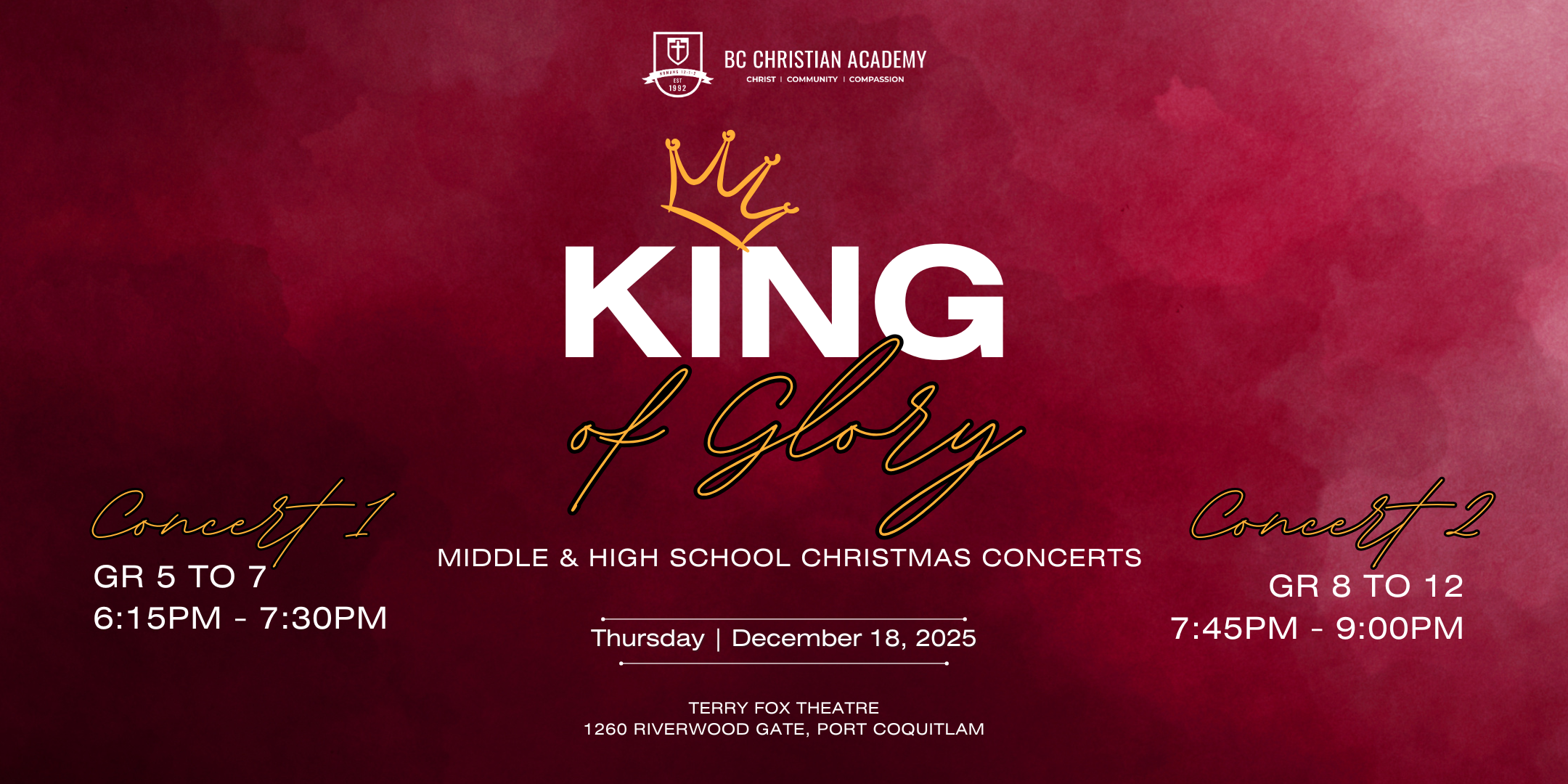 Come and be blessed as we worship together and celebrate the ‘King of Glory’ at our 2025 Middle and High School Christmas Concerts!