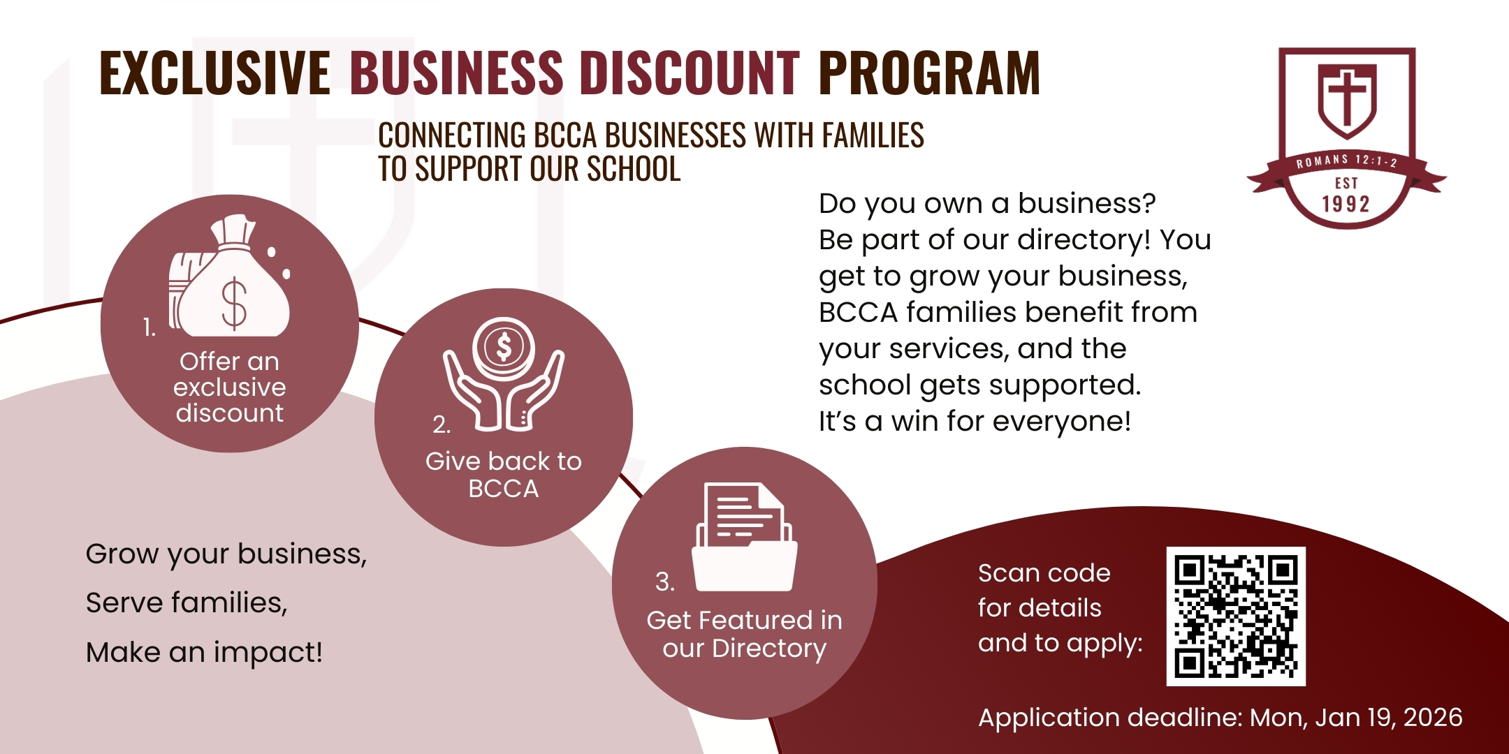 Community is at the heart of BC Christian Academy. Our school is marked by warmth, connection, and a genuine sense of belonging among students, staff, and families. We are excited to extend that spirit of community beyond our classrooms through our Exclusive School Discounts Program—an initiative designed to support BCCA families while strengthening local businesses.